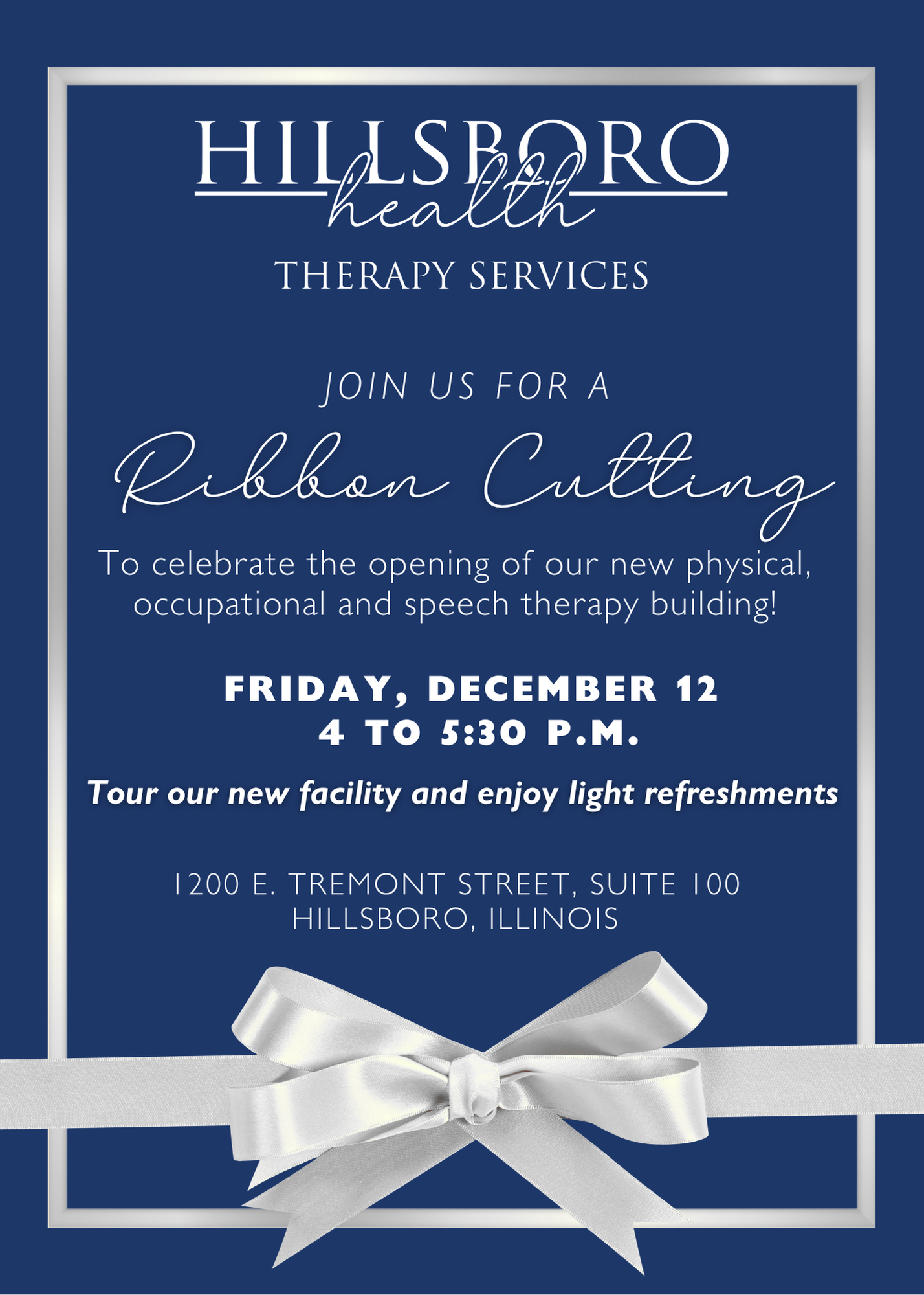 Join us for a Ribbon Cutting on Friday, December 12 from 4 p.m. - 5:30 p.m. Celebrate the opening of Hillsboro Health's new physical, occupational and speech Therapy Services building! Tour our new facility and enjoy light refreshments. All are welcome and encouraged to attend!