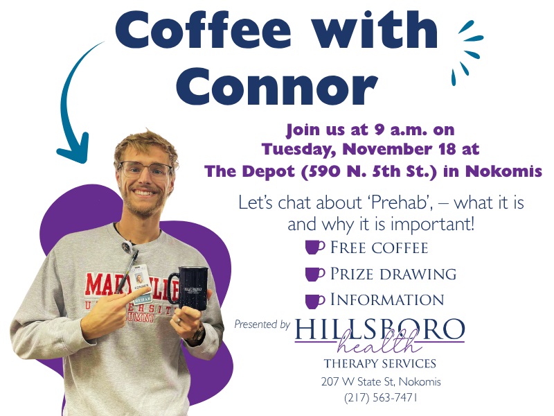 Join certified Physical Therapist Connor Wagahoff, from Hillsboro Health Therapy Services Nokomis clinic, on Tuesday, November 18, 2025 from 9 – 10 a.m. at the Depot Bar and Grill, located at 590 N 5th St. in Nokomis, Illinois. "Coffee with Connor" will include discussion on physical therapy and prehab and why it is important. Wagahoff will follow up with time dedicated to answering questions from attendees.